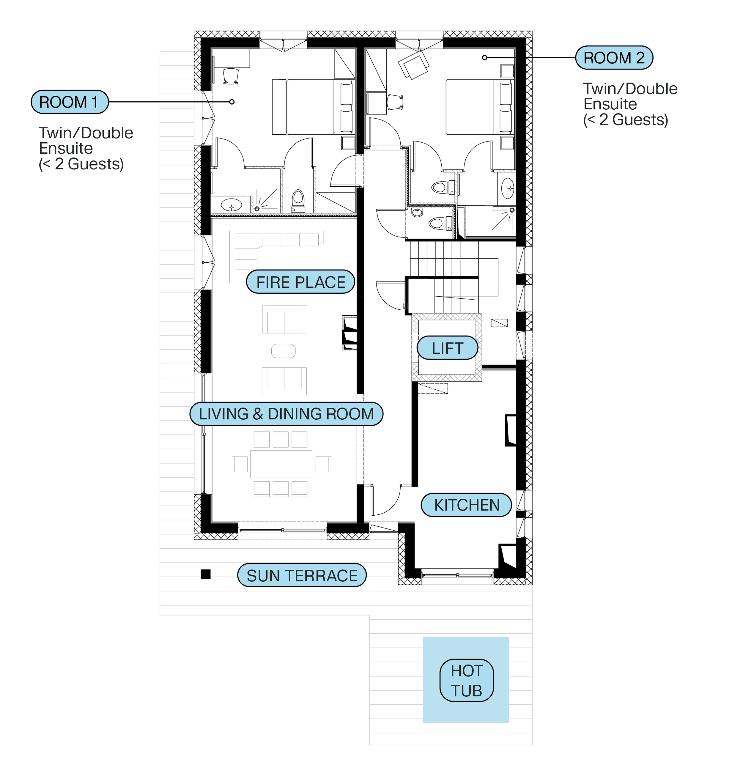 One of the bedrooms is equipped with a wet room and extra width doors to enable wheelchair access, which combined with full lift access to all floors provides the chalet with full disabled access.