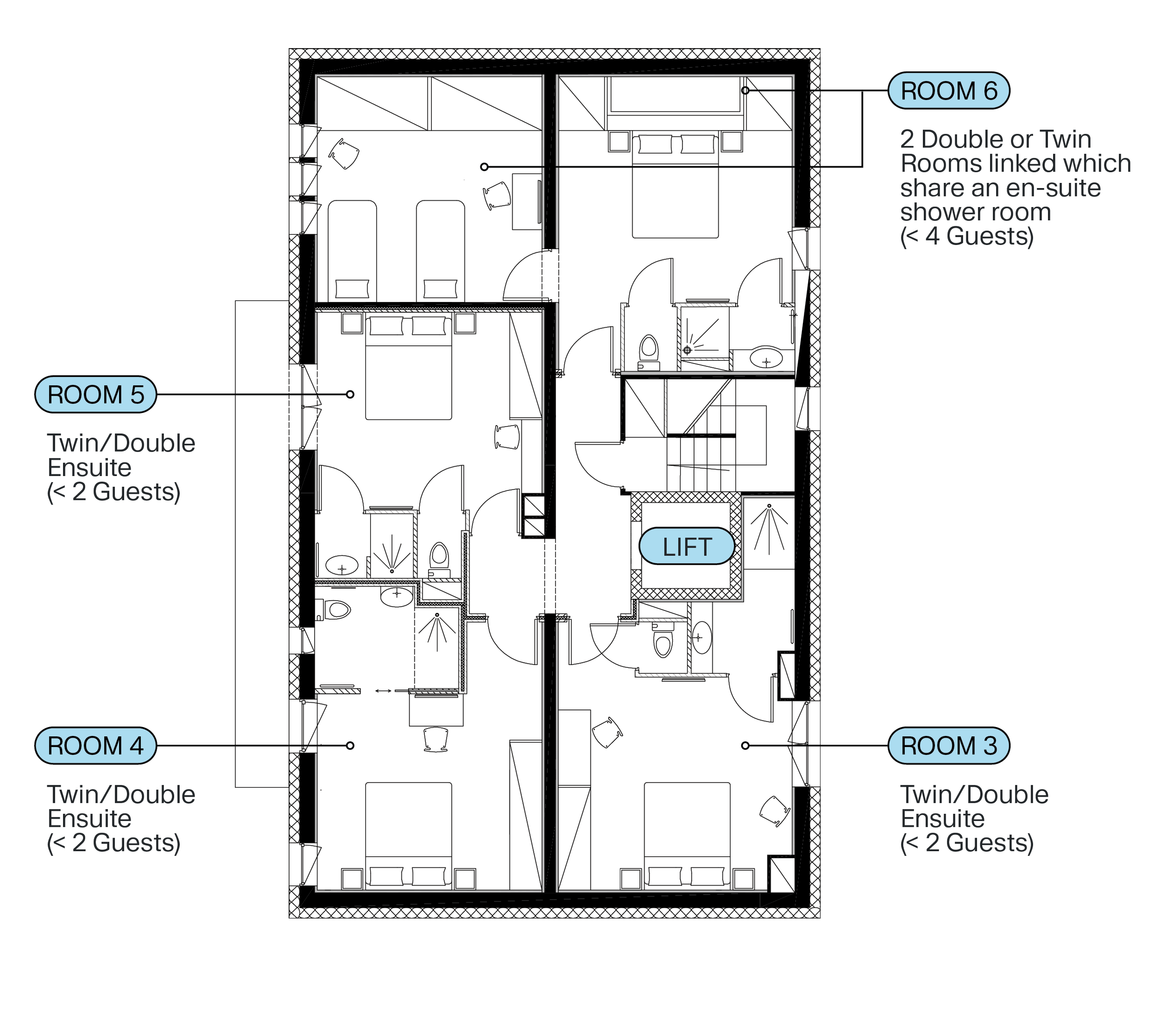 Room 6 - Top Floor - Twin/Double bed, en-suite room with sink and walk in shower. Link door through to room 7, with two twin beds